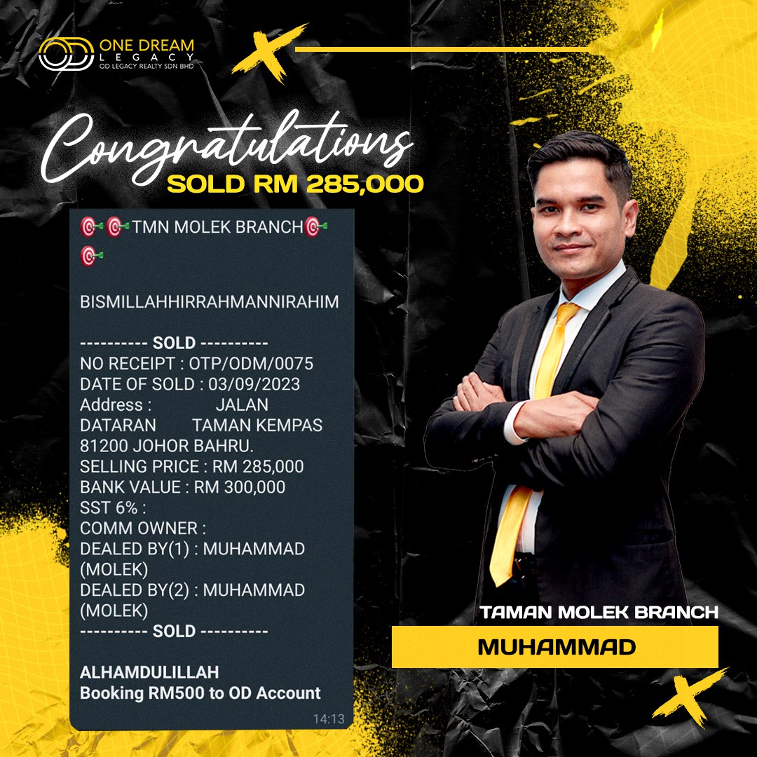 Muhammad merupakan Perunding Hartanah Berdaftar dan bernaung di bawah One Dream Legacy Sdn Bhd dengan no pendaftaran REN45728